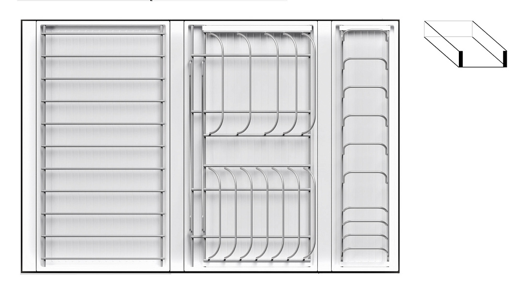 • 1 большой модуль для посуды + 1 малый модуль с решеткой + модуль для столовых приборов